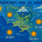 Martedì 27 maggio: di notte ed al mattino, il cielo si presenterà leggermente velato su buona parte del territorio regionale. A partire dalle ore centrali del giorno, si assisterà ad un graduale incremento della copertura nuvolosa nelle aree a ridosso dei principali contrafforti montuosi; in tale contesto, saranno probabili rovesci che, specie sul Fortore, sul Matese e sui rilievi del Cilento, potranno anche assumere localmente carattere temporalesco.Temperatura: minime in lieve aumento con valori compresi tra +9°C e +14°C nelle aree interne e tra +14°C e +18°C lungo la costa ed immediato entroterra. Massime pressoché stazionarie con valori compresi tra +21°C e +25°C, con locali picchi di 26°C nell’entroterra Casertano e nel Beneventano. Vento: prevalentemente debole da direzione variabile o, a tratti, assente di notte, al mattino ed in serata. Nel corso delle ore centrali del giorno, la ventilazione spirerà dai quadranti occidentali con debole o, localmente, moderata intensità. Mare: quasi calmi o poco mossi sotto costa, mossi a largo, i Golfi di Napoli e Salerno. Tra poco mossi e mossi gli altri bacini.