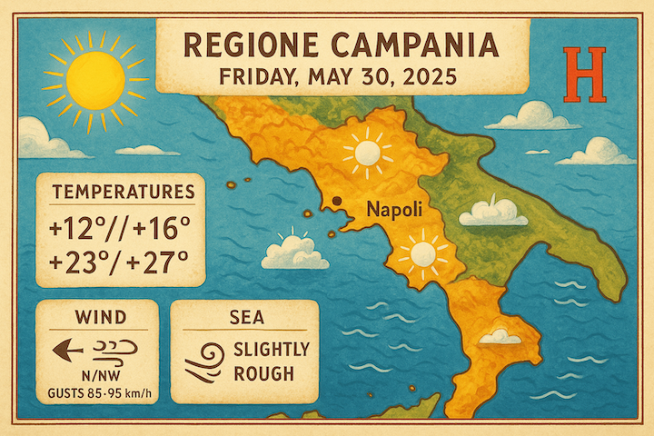 Wind: For most of the day, predominantly moderate from the North/Northeast; however, in the afternoon, the wind will shift to the Northwest along the Caserta and Naples coastal areas. In this context, gusts up to 85-95 km/h are expected near significant mountain slopes and coastal sectors, especially between morning and afternoon.