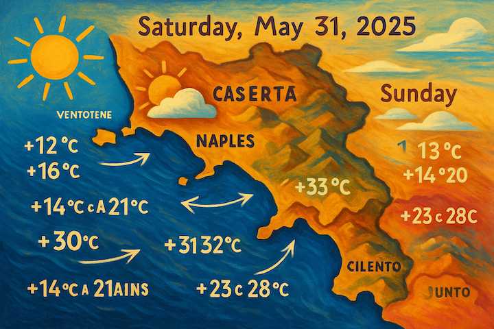 Temperatures: Minimums will be steady or slightly rising, ranging between +12°C and +16°C in inland areas and between +14°C and +21°C along the coast and main plains. Maximums will rise slightly, generally ranging from +23°C to +30°C, with possible local peaks of +31°C/+32°C in the Vesuvian area and the inland areas of Naples.